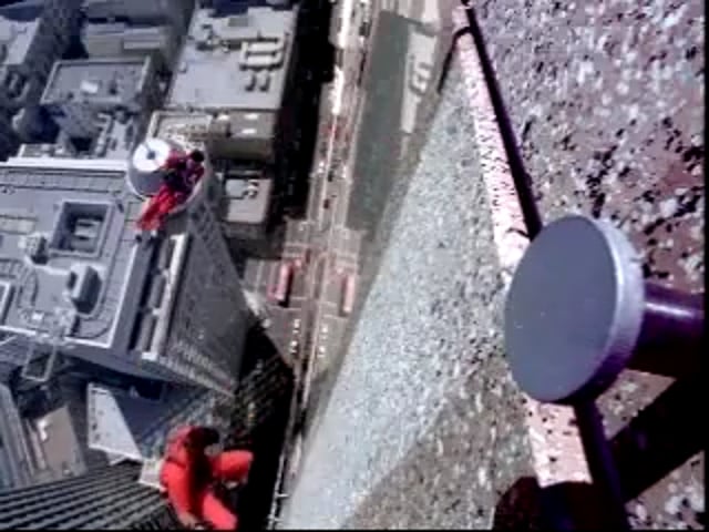 We shot this during the big SAG actor’s strike, so we ended up casting a couple of actual stunt performers to put on the harnesses. It was a lot of greenscreen and effects, but still. That’s really them swinging around up there.